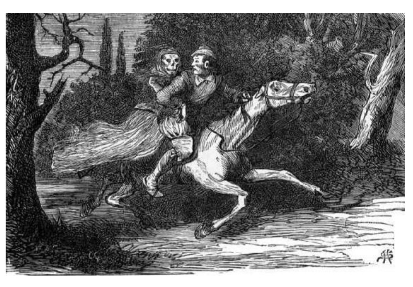 “Grinning in a dainty little hood, and almost touching his face, there was a ghastly skull, with eyeless sockets, and teeth gleaming white in the clear moonlight”.