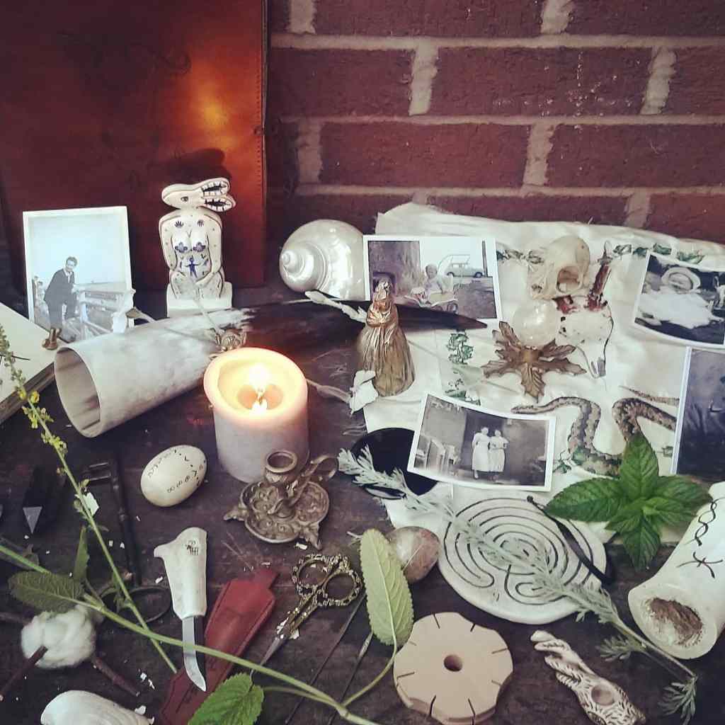 For me personally, as usual, I cannot sit comfortably in either camp. I straddle the middle path from growing up around Christian folk magic and mediumship, but then breaking free to explore neo-paganism and Druidry in my 20’s, so some of my tools take influence from my upbringing, such as my scissors, knife, braiding star and blackberry hoop. And others come either from more modern pagan influences or from my research into local regional witchcraft of my now home, Lancashire. My home throughout is relatively normal looking until you reach the front room, where a very obvious altar sit upon a gorgeous welsh dresser.