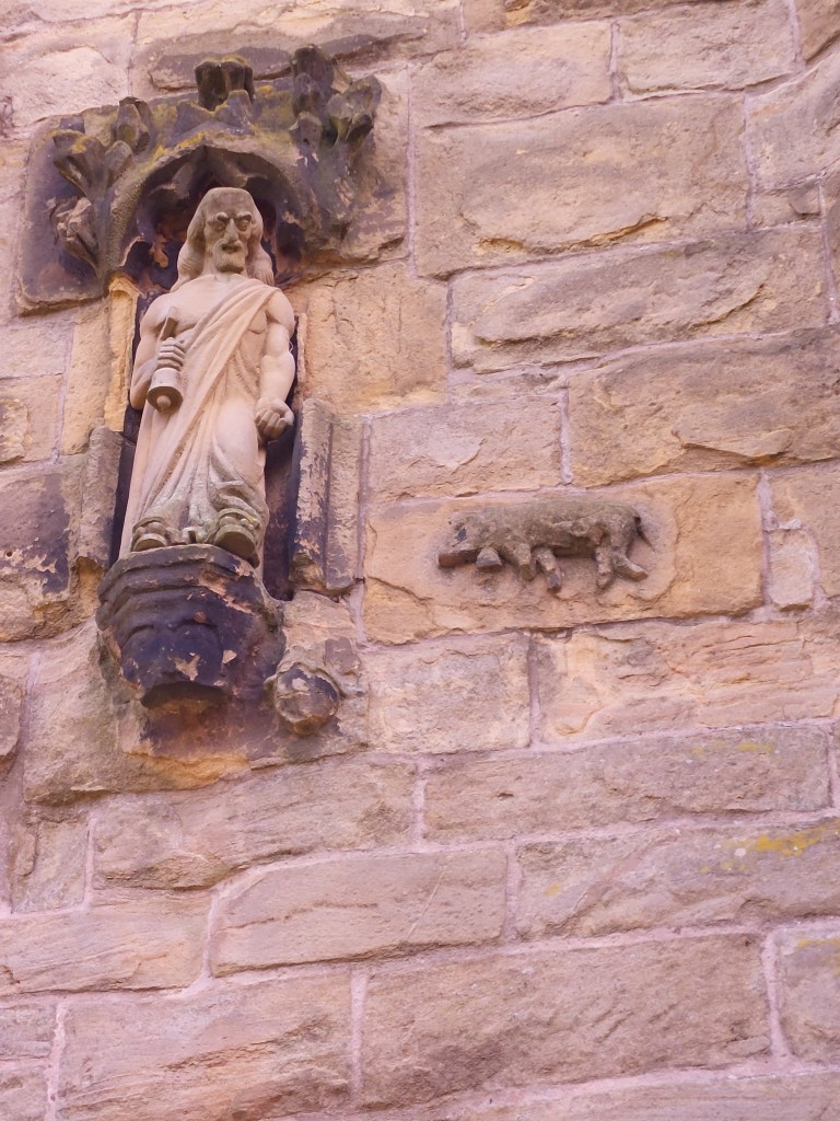 There is some debate as to whether or not this carving is supposed to be that of a pig, some speculate it to be a lion emblem for a local family that used to live in the area. However, the shape of the animal is nothing like a lion and is very much like a pig. It also has a bell tied to its neck – bells were also apparently prized by St Anthony of Egypt. They were also sometimes used on livestock to keep track of where they were grazing. But I cannot think of an occasional where a lion wore a bell around it’s neck…