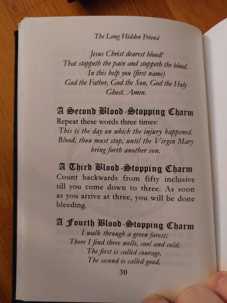 There are many documented examples of traditional blood staunching charms that were used by Charmers, Pellars and Folk Witches alike here in both the British and Celtic isles. There is also a plethora of examples that come from our Pennsylvanian Dutch Cousins, over the waters in America. One example of this would be from the small Pennsylvanian Dutch folk magic book called “The Long-Hidden Friend”.